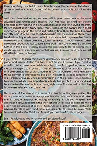 THIS BOOK DOESN'T CONTAIN ANY ARABIC LETTERS! ALL ARABIC WORDS IN THIS BOOK WERE WRITTEN IN ENGLISH-TRANSLITERATION!Have you always wanted to learn how to speak the Lebanese, Syrian, Palestinian and Jordanian Arabic dialects, also known as Levantine Arabic, but you simply did not have the time?Well if so, then, look no further. You can hold in your hands one of the most advanced and revolutionary method that was ever designed for quickly becoming conversational in a language. In creating this time-saving program, master linguist Yatir Nitzany spent years examining the twenty-seven most common languages in the world and distilling from them the three hundred and fifty words that are most likely to be used in real conversations. These three hundred and fifty words were chosen in such a way that they were structurally interrelated and, when combined,form sentences. Through various other discoveries about how real conversations work--discoveries that are detailed further in this book--Nitzany created the necessary tools for linking these words together in a specific way so that you may become rapidly and almost effortlessly conversant--now.If your desire is to learn complicated grammatical rules or to speak perfectly proper and precise Arabic, this book is not for you. However, if you need to actually hold a conversation while on a trip to an Arab speaking country in the Levant, to impress that certain someone, or to be able to speak with your grandfather or grandmother as soon as possible, then the Nitzany Method is what you have been looking for. This method is designed for fluency in a foreign language, while communicating in the present tense. Nitzany believes that what's most important is actually being able to understand and be understood by another human being right away. More formalized training in grammar rules, etc., can come later.This isn't a pronunciation book. Thus, this book is recommended for those with prior knowledge in pronunciation of the Arabic language. However, for those who aren't previously familiar, this book does provide some basic tools to teach pronunciation. The only purpose of this book is to provide you with the necessary tools to become conversational in a foreign language in record time. As previously stated, though, with regards to grammar and pronunciation, you are on your own!This is one of the several, in a series of instructional language guides, the Nitzany Method's revolutionary approach is the only one in the world that uses its unique language technology to actually enable you to speak and understand native speakers in the shortest amount of time possible. No more depending on volumes of books of fundamental, beginner, intermediate,and advanced levels, all with hundreds of pages in order to learn a language. With Conversational Arabic Quick and Easy, all you need is this book.Learn the Levantine Arabic dialect today, not tomorrow, and get started now!